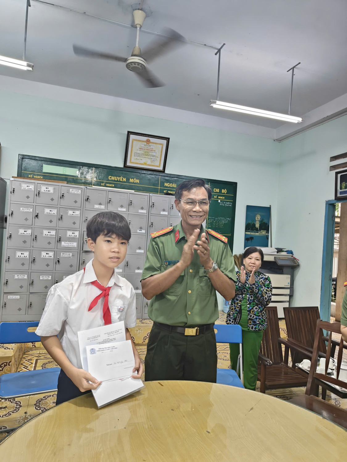 Thượng tá Lê Ngọc Mến trao quyết định nhận đỡ đầu cho em Võ Mình Thành, học sinh trường THCS Nguyễn Đình Chiểu
