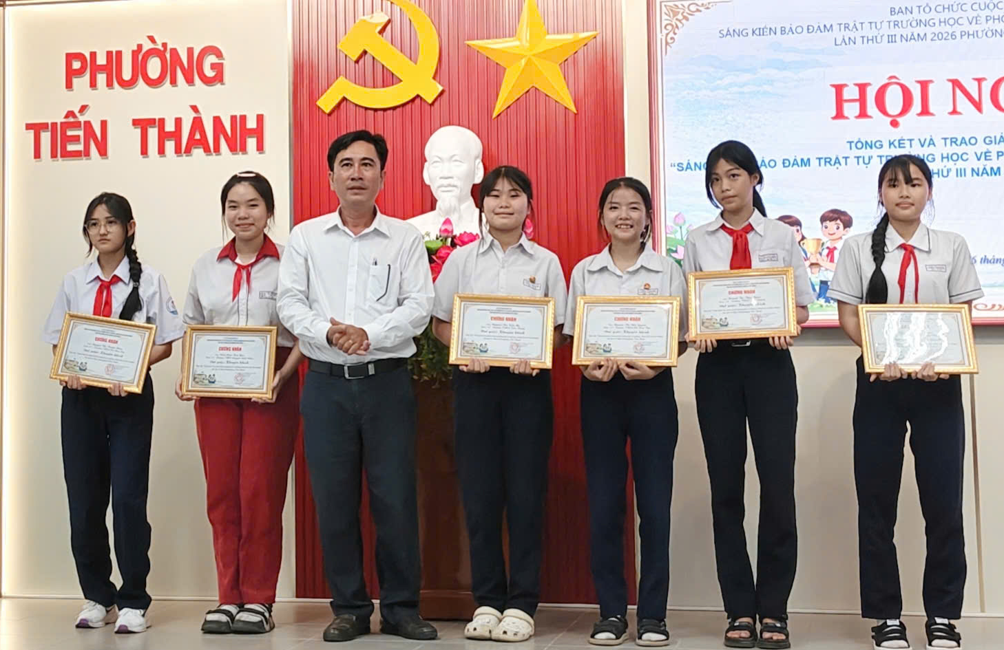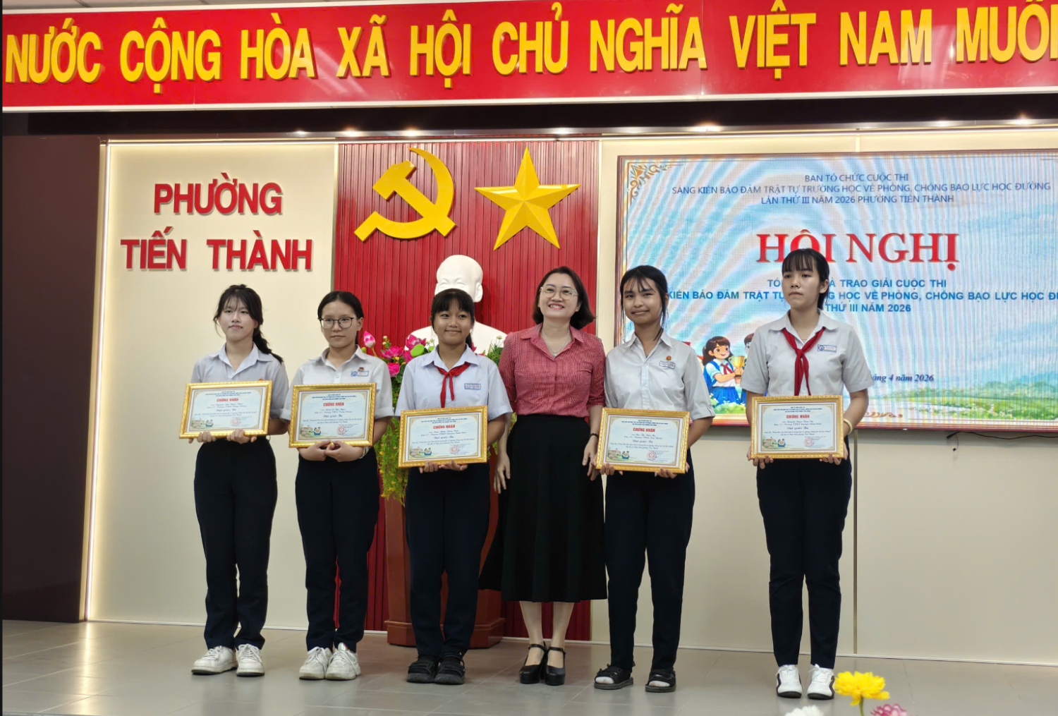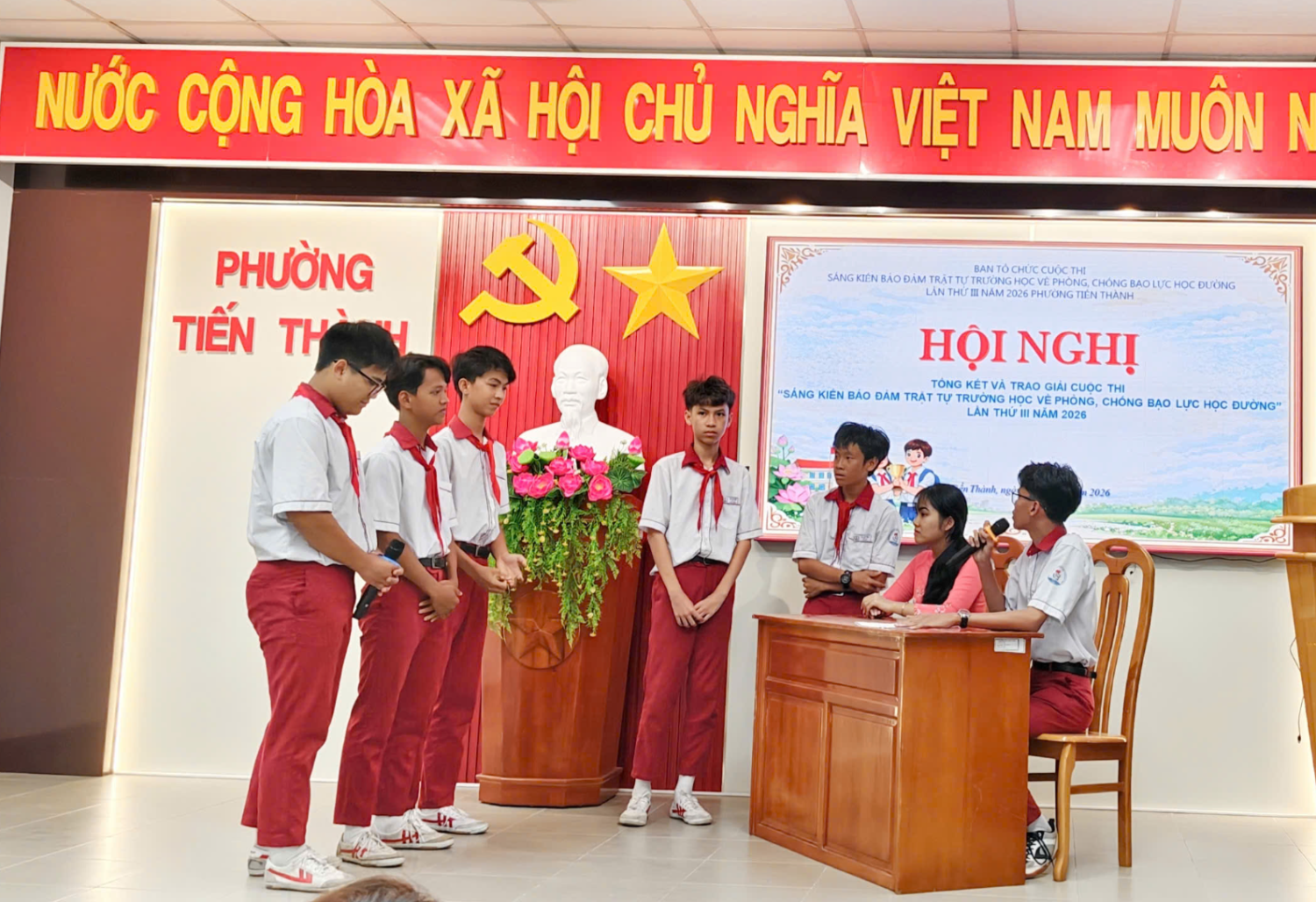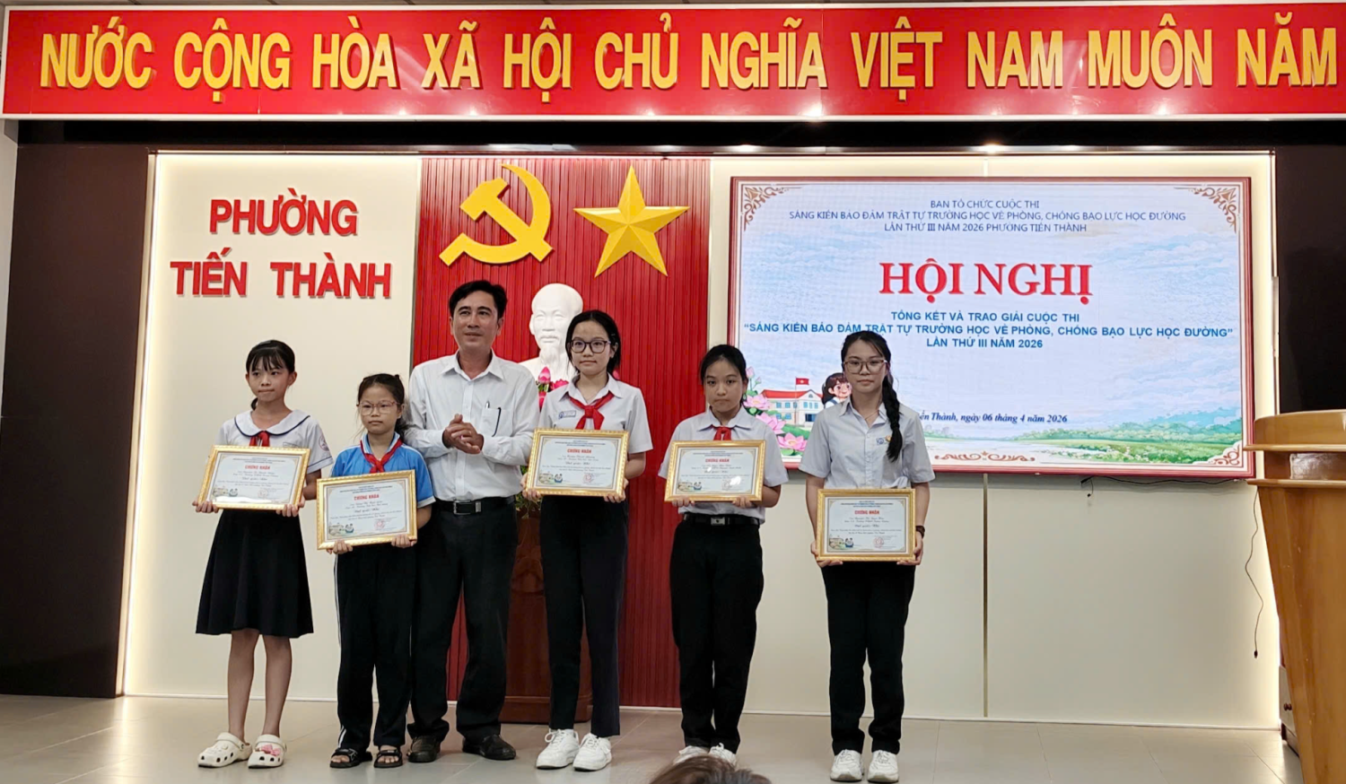 <p><span style="font-family:&#039;Google Sans Text&#039;, sans-serif !important;font-size:18px;"><span class="citation-113" style="line-height:1.15 !important;margin-top:0px !important;" data-path-to-node="2,1">Chiều ngày 06/4/2026, tại Hội trường A – UBND phường Tiến Thành </span><span class="citation-112" style="line-height:1.15 !important;margin-top:0px !important;" data-path-to-node="2,4">, Hội nghị tổng kết và trao giải Cuộc thi “Sáng kiến bảo đảm trật tự trường học về phòng, chống bạo lực học đường” lần thứ III năm 2026 đã được tổ chức trong không khí trang trọng và ý nghĩa</span><span style="line-height:1.15 !important;margin-top:0px !important;" data-path-to-node="2,6">. Đây là hoạt động thiết thực nhằm nâng cao nhận thức, trách nhiệm của toàn xã hội, đặc biệt là học sinh, trong việc xây dựng môi trường học đường an toàn, lành mạnh, thân thiện.</span></span></p>
