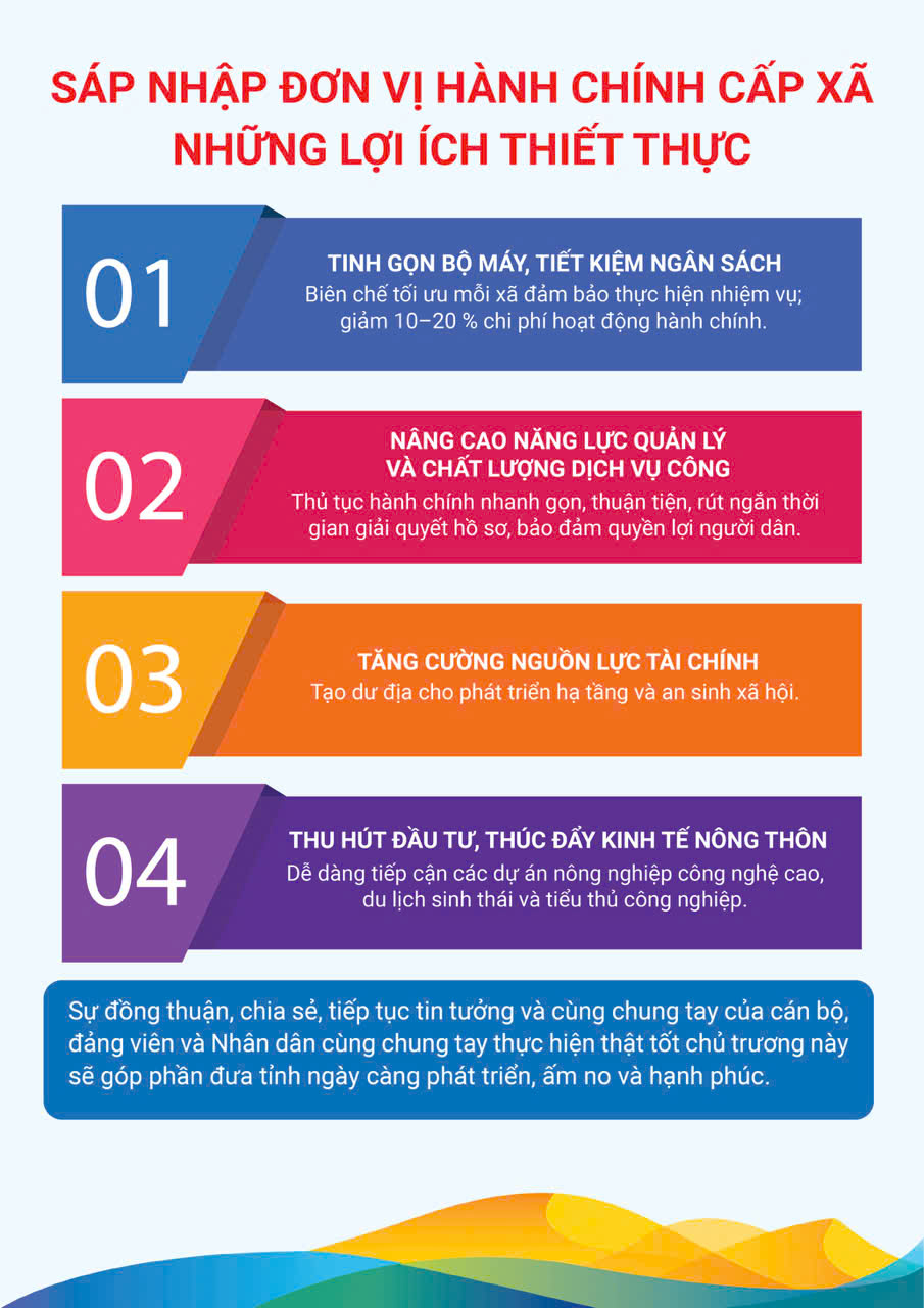 Hãy cùng nhau tìm hiểu kỹ lưỡng về chủ trương này, chia sẻ thông tin chính xác, tích cực hưởng ứng và đóng góp sức lực, trí tuệ để xây dựng các đơn vị hành chính sau sáp nhập ngày càng vững mạnh, góp phần đưa quê hương, đất nước ngày càng giàu đẹp, văn minh và phát triển bền vững!