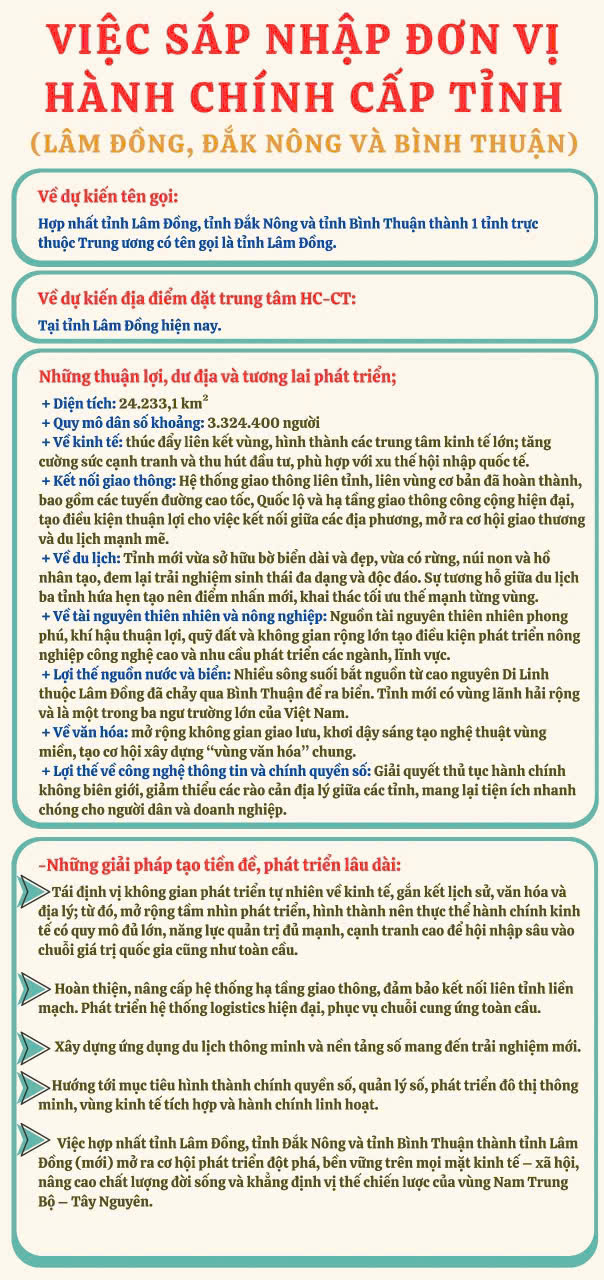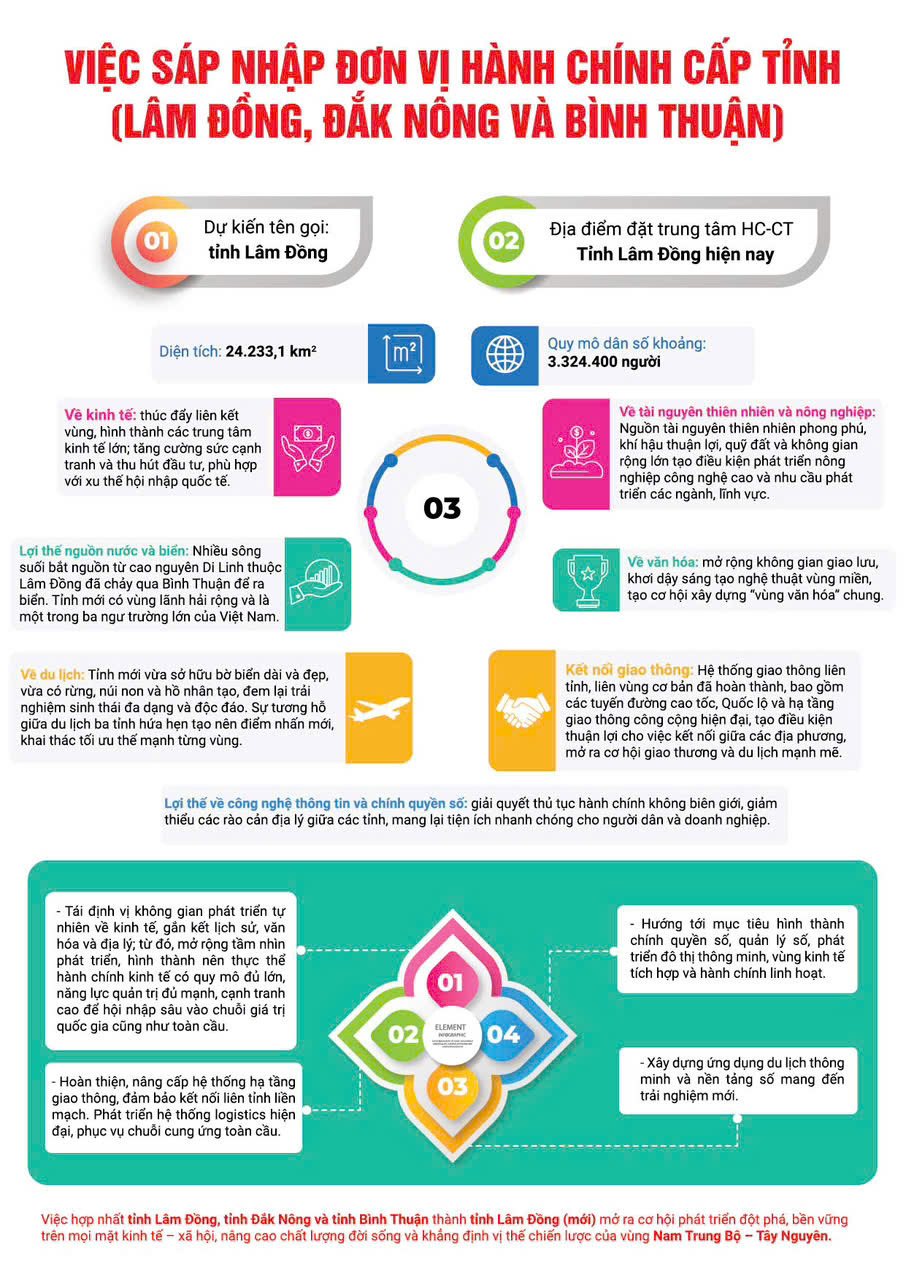 Với quy mô dự kiến diện tích khoảng 24.233,1 km² và dân số khoảng 3.324.400 người, đơn vị hành chính mới (dự kiến tên gọi: Tỉnh Lâm Đồng, đặt trung tâm hành chính tại TP. Đà Lạt hiện nay) sẽ sở hữu những tiềm năng to lớn và lợi ích đột phá: