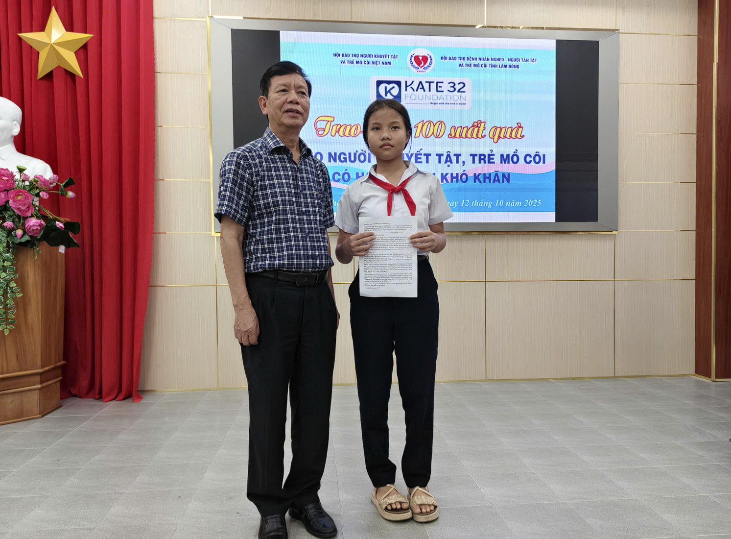 Đại diện cho 100 bạn học sinh nhận học bổng lần này, em Võ Ngọc Ánh Dương, học sinh lớp 6A1, trường THCS Nguyễn Đình Chiểu đã có bài phát biểu xúc động, bày tỏ lòng biết ơn sâu sắc. Trong bài phát biểu của mình, em Ánh Dương chia sẻ: "Chúng em là những học sinh có hoàn cảnh còn nhiều khó khăn. Con đường đến trường của chúng em còn lắm gập ghềnh, trắc trở. Có những lúc, gánh nặng về vật chất đã trở thành nỗi lo lớn, ảnh hưởng không nhỏ đến việc học tập. Nhưng hôm nay, tại Hội trường Đảng ủy phường Phan Thiết này, chúng em đã nhận được sự sẻ chia quý báu từ quý vị. Những suất học bổng này không chỉ là một sự hỗ trợ về vật chất giúp chúng em trang trải chi phí học tập, mua sắm sách vở, đồ dùng, mà còn là nguồn động viên tinh thần to lớn. Món quà này thắp lên trong chúng em niềm tin rằng, trên hành trình vượt khó vươn lên, chúng em không bao giờ đơn độc mà luôn có sự đồng hành, chở che của xã hội và cộng đồng. Trước tình cảm và sự tin tưởng của quý vị, thay mặt các bạn được nhận học bổng hôm nay, em xin hứa sẽ sử dụng phần quà này một cách ý nghĩa và thiết thực nhất. Chúng em nguyện sẽ nỗ lực nhiều hơn nữa trong học tập, rèn luyện đạo đức, phấn đấu trở thành con ngoan, trò giỏi, cháu ngoan Bác Hồ, để không phụ lòng mong mỏi của gia đình, thầy cô và các nhà hảo tâm."