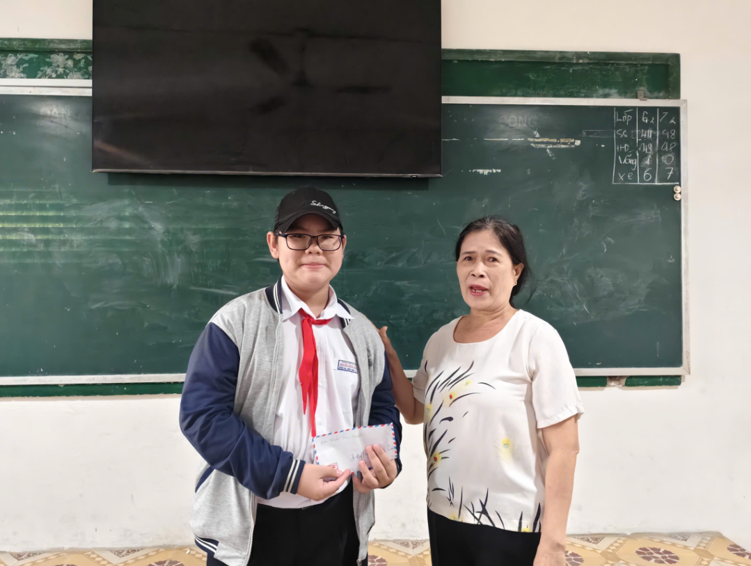 Sau khi biết hoàn cảnh khó khăn của em Quân, Nhóm Mai Quyên – trong đó có một số thành viên là cựu học sinh Trường THCS Nguyễn Đình Chiểu – đã nhanh chóng phối hợp với cô Thọ để gửi lời thăm hỏi và chia sẻ với gia đình. Sáng nay, cô Nguyễn Thị Thọ thay mặt nhóm đến tận lớp trao số tiền hỗ trợ 3.000.000 đồng cho em Quân, đồng thời gửi lời động viên, khích lệ tinh thần để em tiếp tục kiên cường chiến đấu với bệnh tật.