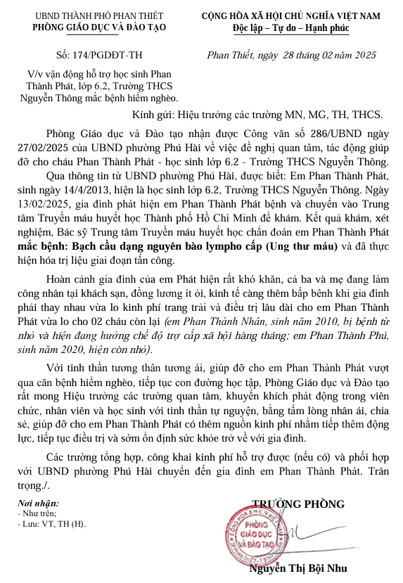 Công văn vận động hỗ trợ học sinh Phan Thành Phát, lớp 6.2, Trường THCS Nguyễn Thông mắc bệnh hiểm nghèo
