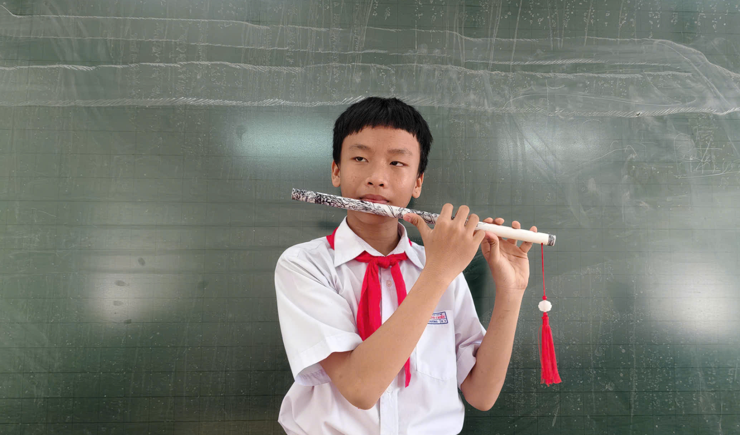 Xuất phát từ ý tưởng tận dụng rác thải nhựa và niềm yêu thích nhạc cụ dân tộc, Minh Chương đã biến những ống nhựa PVC đã qua sử dụng thành một cây sáo có thể phát ra âm thanh trong trẻo, mang âm hưởng quê hương. Bằng sự tỉ mỉ, khéo léo và óc sáng tạo, em đã tự tay chế tác nên một sản phẩm vừa có giá trị nghệ thuật, vừa có tính ứng dụng cao.
