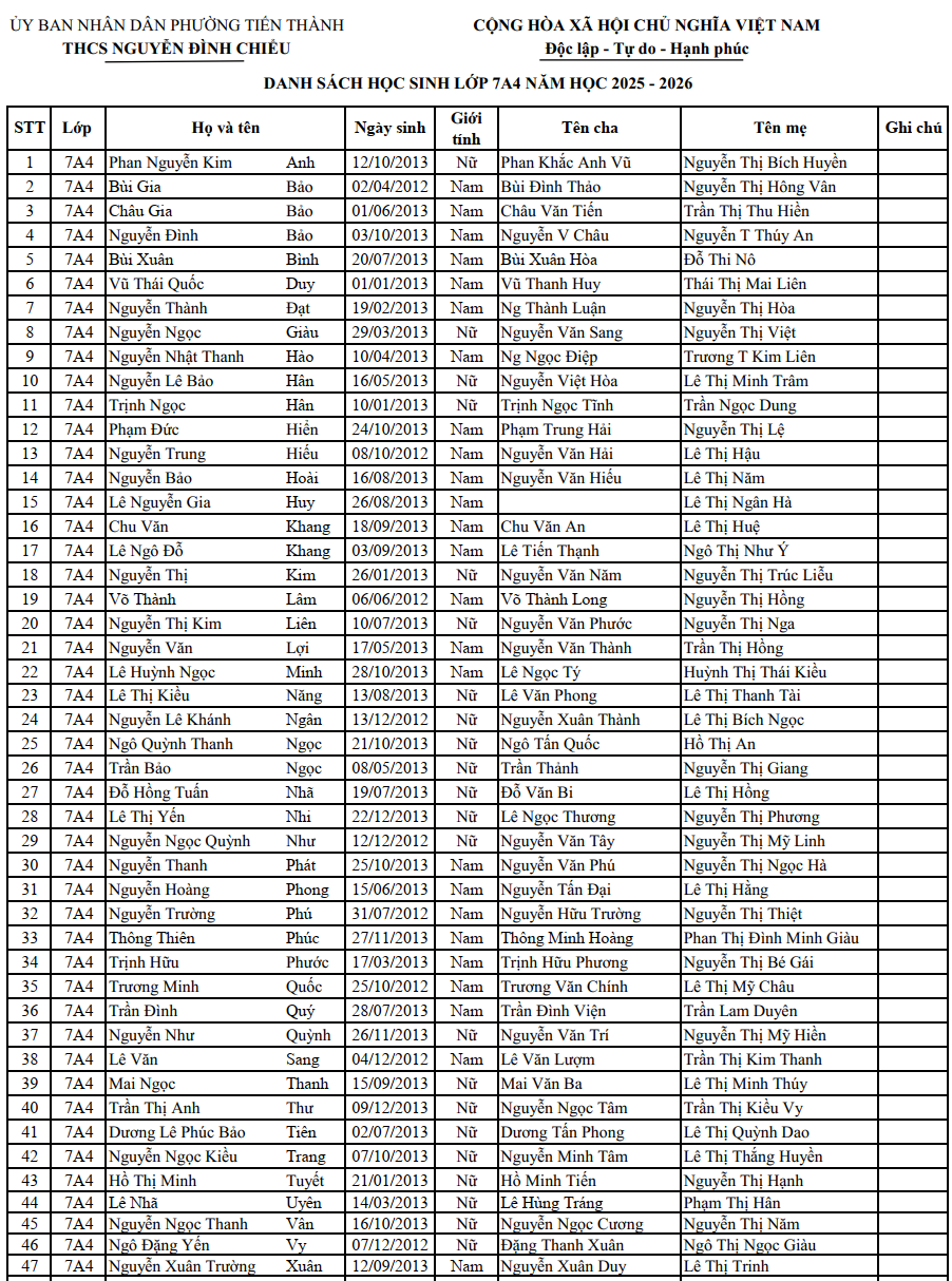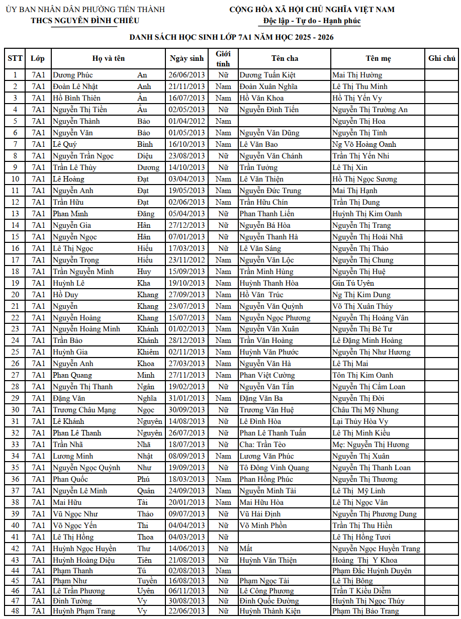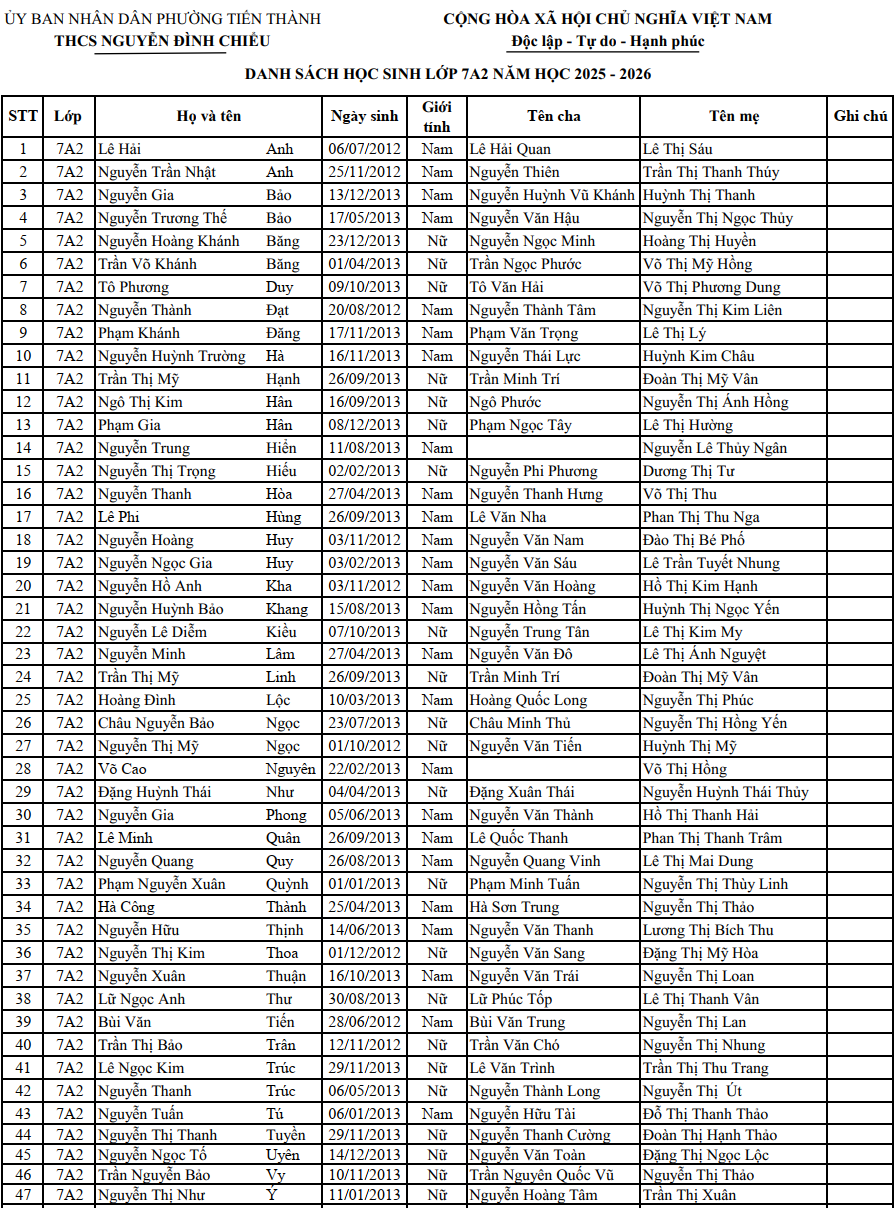 DANH SÁCH HỌC SINH TRÚNG TUYỂN VÀO LỚP 6 NĂM HỌC 2025–2026