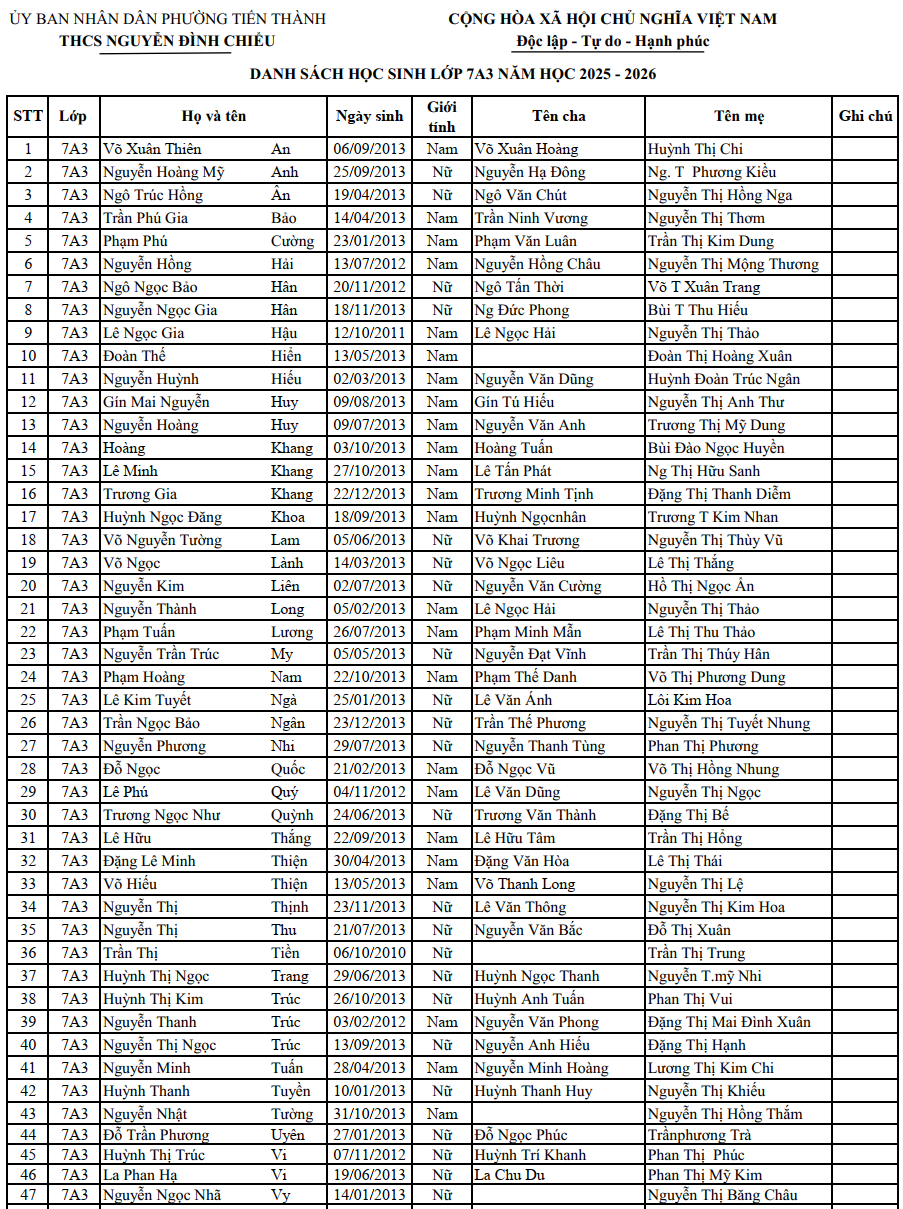 DANH SÁCH HỌC SINH KHỐI 9 NĂM HỌC 2025 - 2026