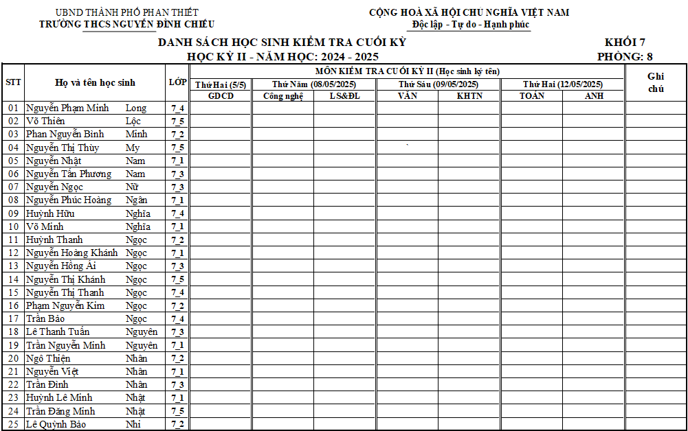 DANH SÁCH HỌC SINH KHỐI 8 NĂM HỌC 2025 - 2026