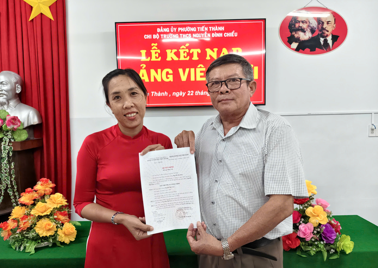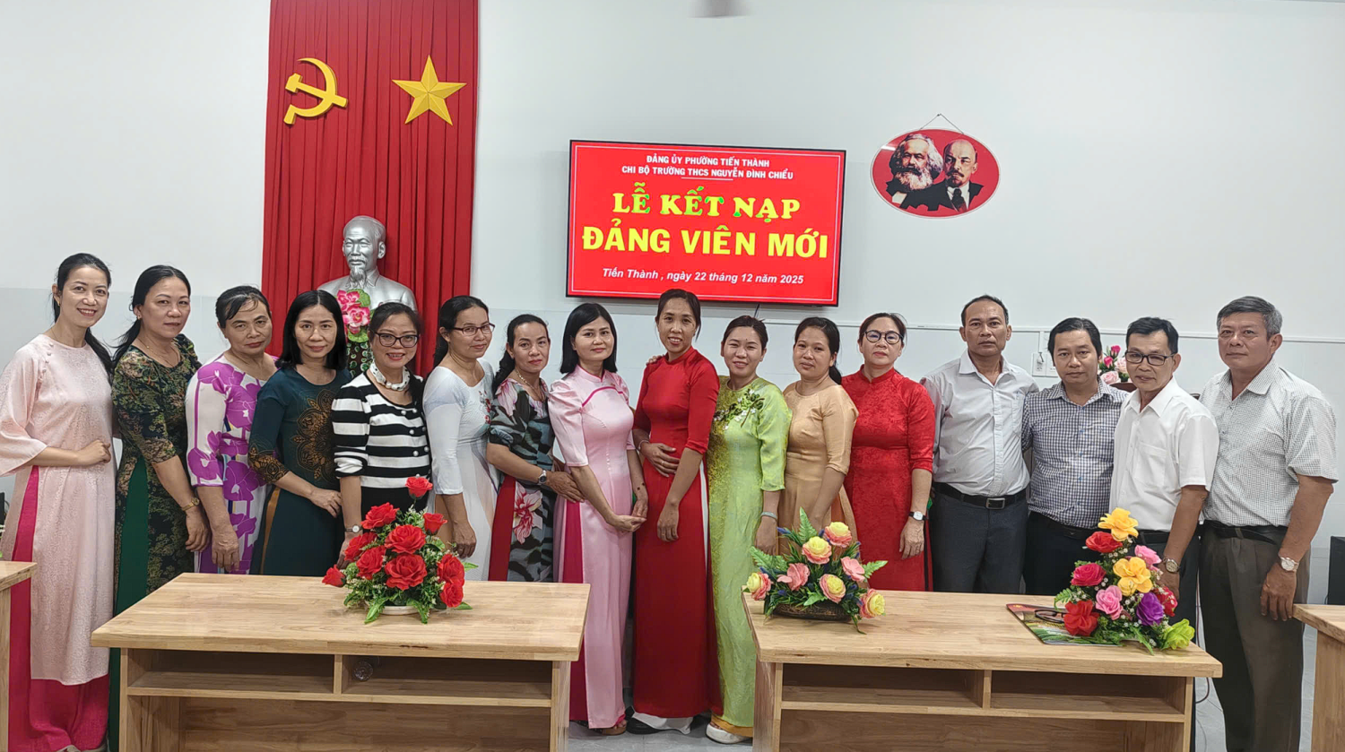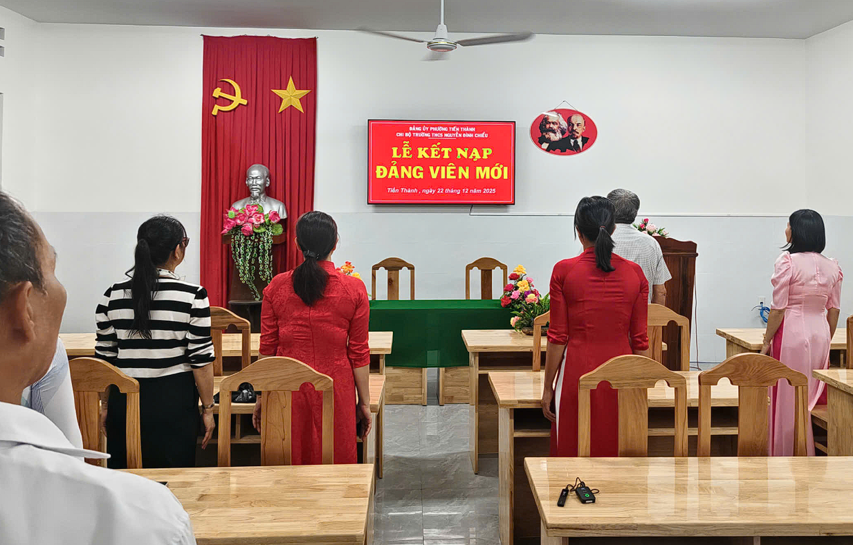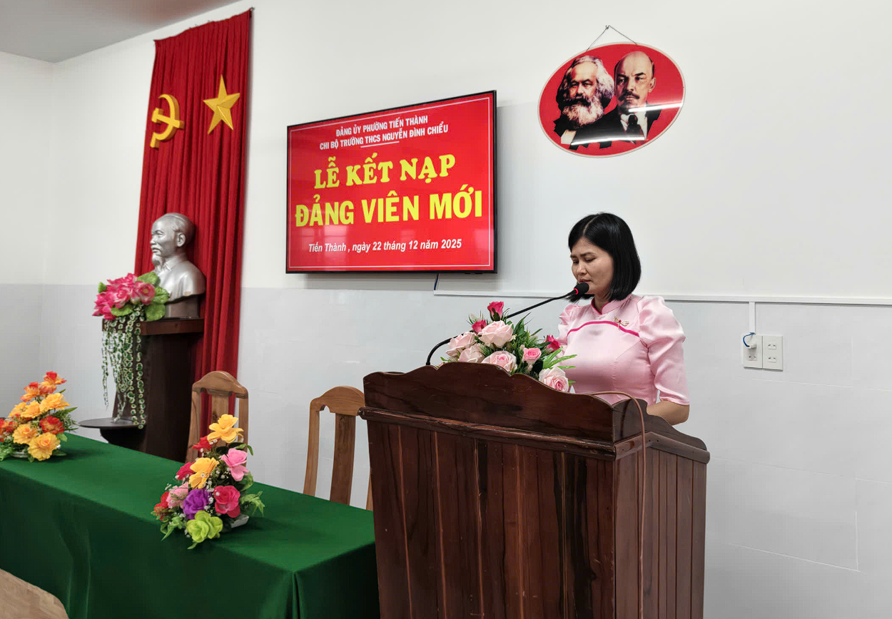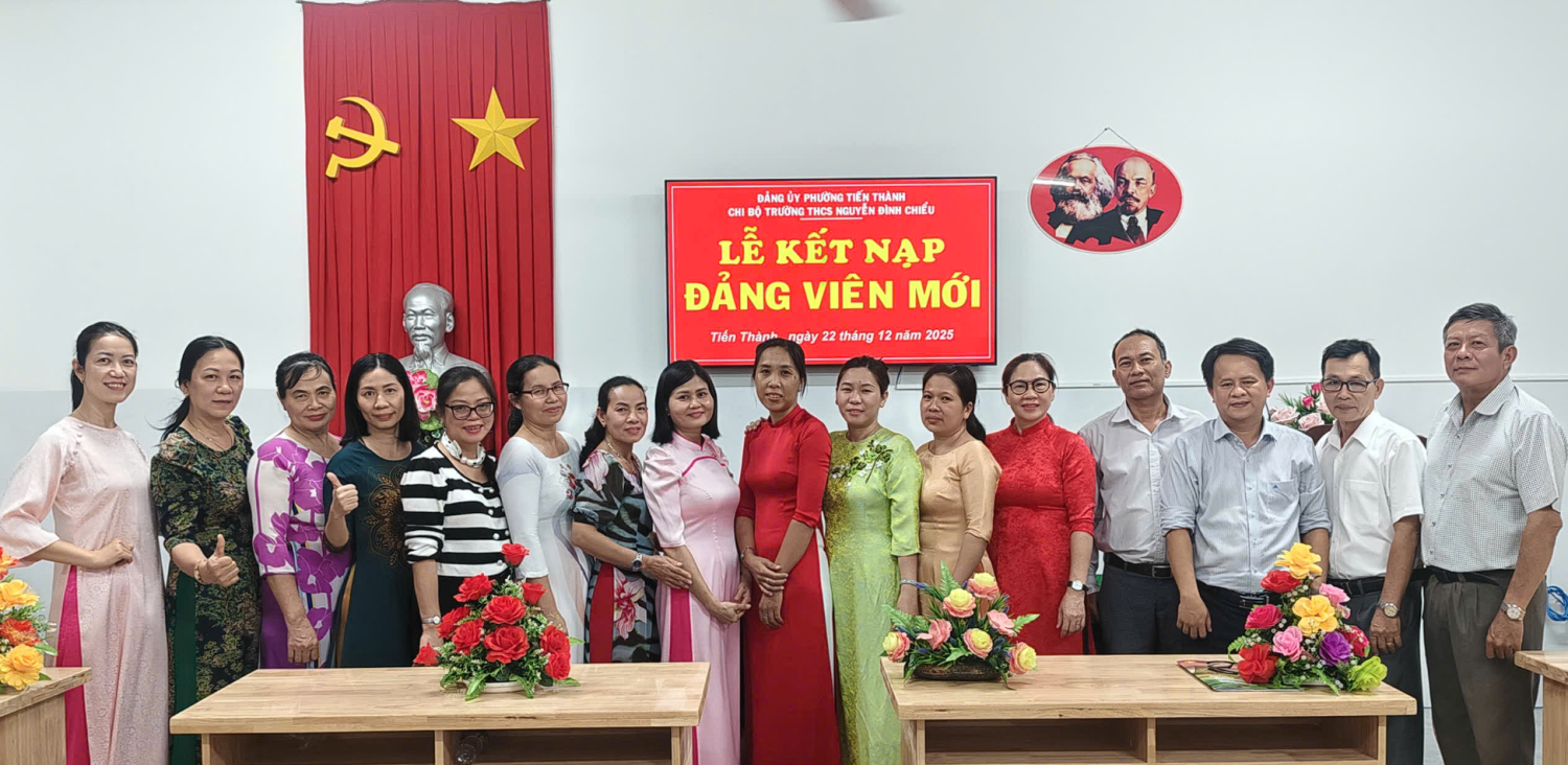 Vào ngày 22/12/2025, trong không khí hào hùng kỷ niệm ngày thành lập Quân đội Nhân dân Việt Nam, Chi bộ trường THCS Nguyễn Đình Chiểu đã trang trọng tổ chức lễ kết nạp Đảng viên cho quần chúng ưu tú Nguyễn Thị Toàn. Đây không chỉ là một sự kiện chính trị quan trọng của nhà trường mà còn mang ý nghĩa sâu sắc khi diễn ra vào ngày lịch sử của dân tộc.