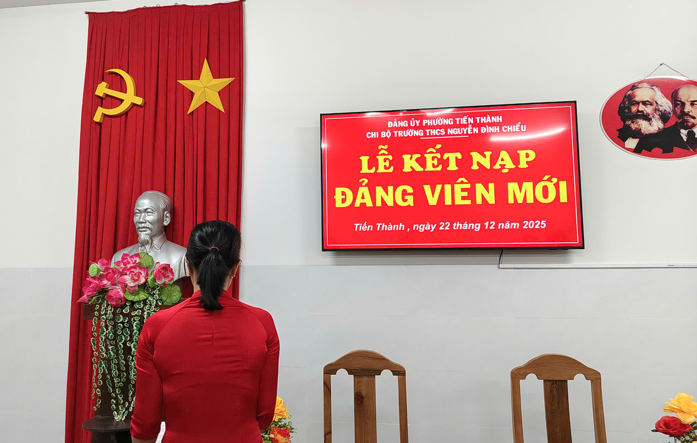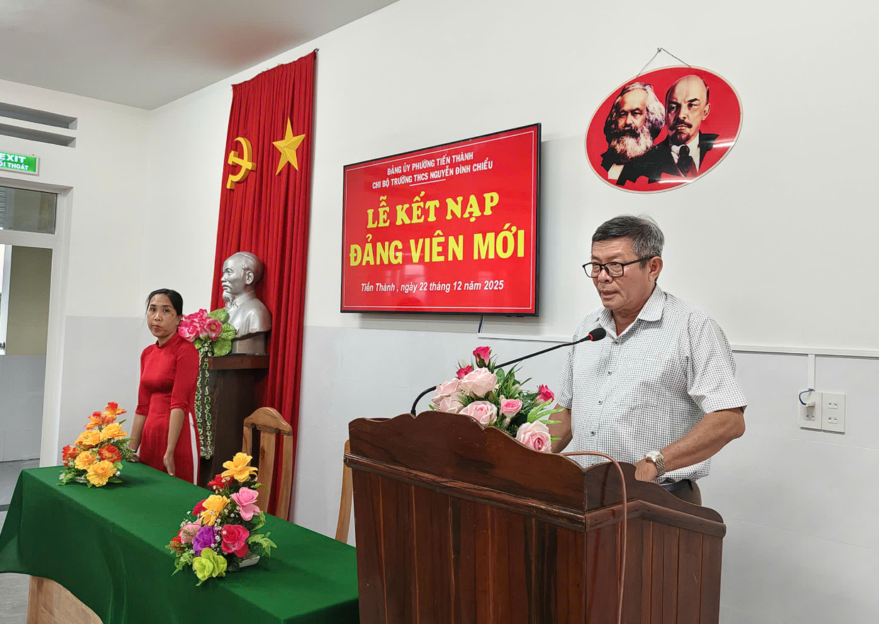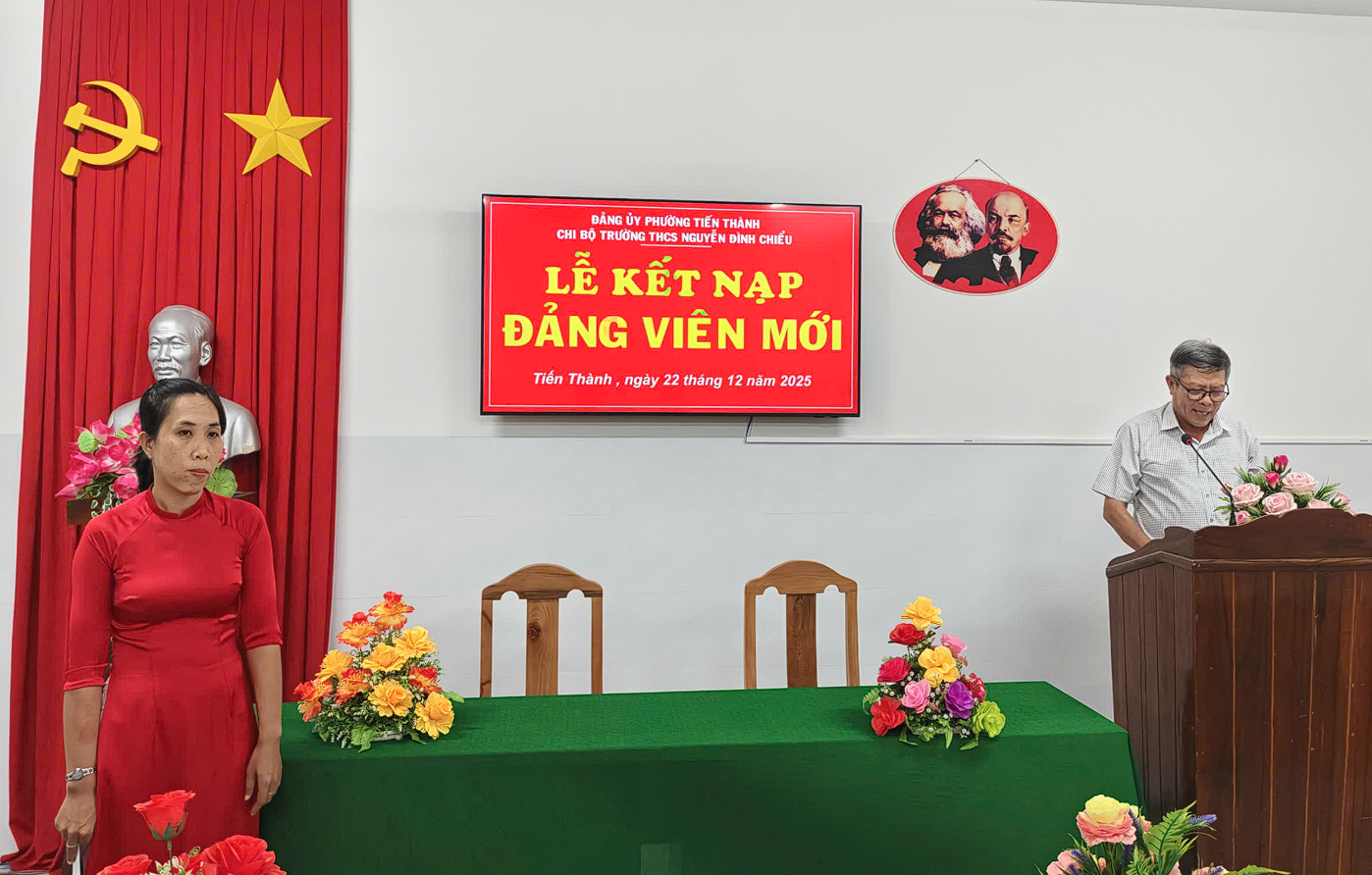 Dưới sự điều hành của đồng chí Nguyễn Thị Như Hiệp, buổi lễ đã diễn ra đúng trình tự và quy định của Điều lệ Đảng. Sau nghi thức chào cờ thiêng liêng, đồng chí Nguyễn Hoàng Khuyết – Bí thư Chi bộ đã công bố Quyết định số 51-QĐ/ĐU ngày 11/12/2025 của Ban Thường vụ Đảng ủy phường Tiến Thành về việc kết nạp cô Nguyễn Thị Toàn vào Đảng Cộng sản Việt Nam.
