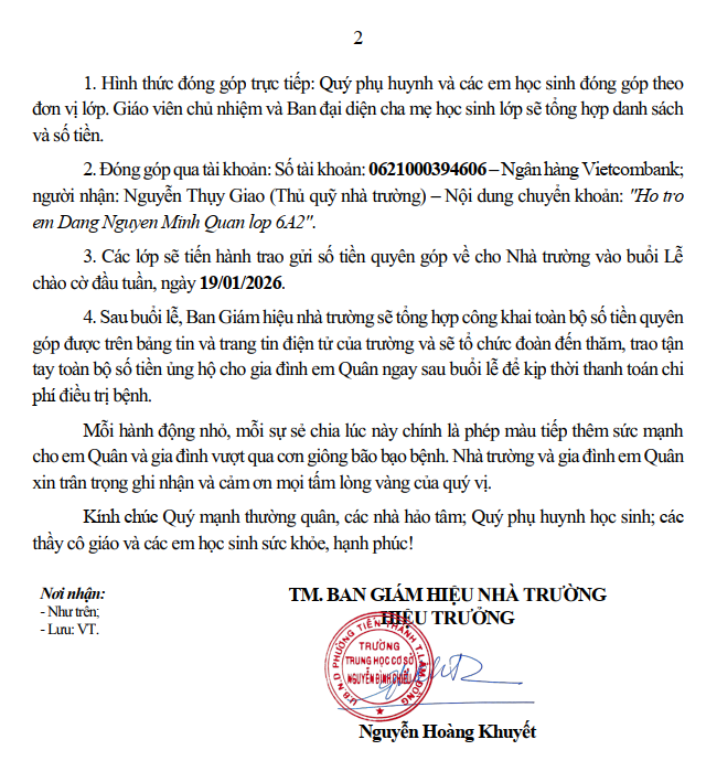 CÔNG KHAI KẾT QUẢ VẬN ĐỘNG VÀ BÀN GIAO TIỀN HỖ TRỢ EM ĐẶNG NGUYỄN MINH QUÂN (LỚP 6A2)