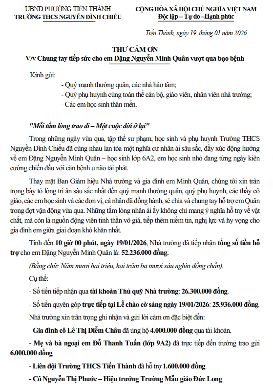 Tính đến 09 giờ 00 phút ngày 19/01/2026, Nhà trường đã tiếp nhận tổng số tiền hỗ trợ dành cho em Đặng Nguyễn Minh Quân là 52.236.000 đồng (Năm mươi hai triệu, hai trăm ba mươi sáu nghìn đồng chẵn).