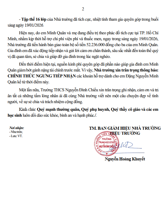 Đến thời điểm hiện tại, nguồn kinh phí quyên góp đã phần nào giúp gia đình em Minh Quân vơi bớt gánh nặng tài chính trước mắt. Vì vậy, Trường THCS Nguyễn Đình Chiểu xin trân trọng thông báo: chính thức ngưng tiếp nhận các khoản hỗ trợ dành cho em Đặng Nguyễn Minh Quân kể từ thời điểm này.