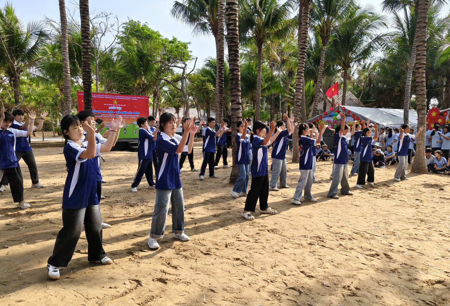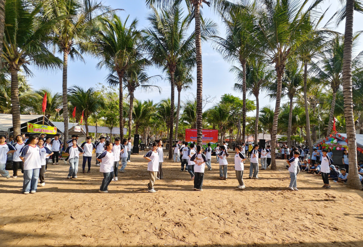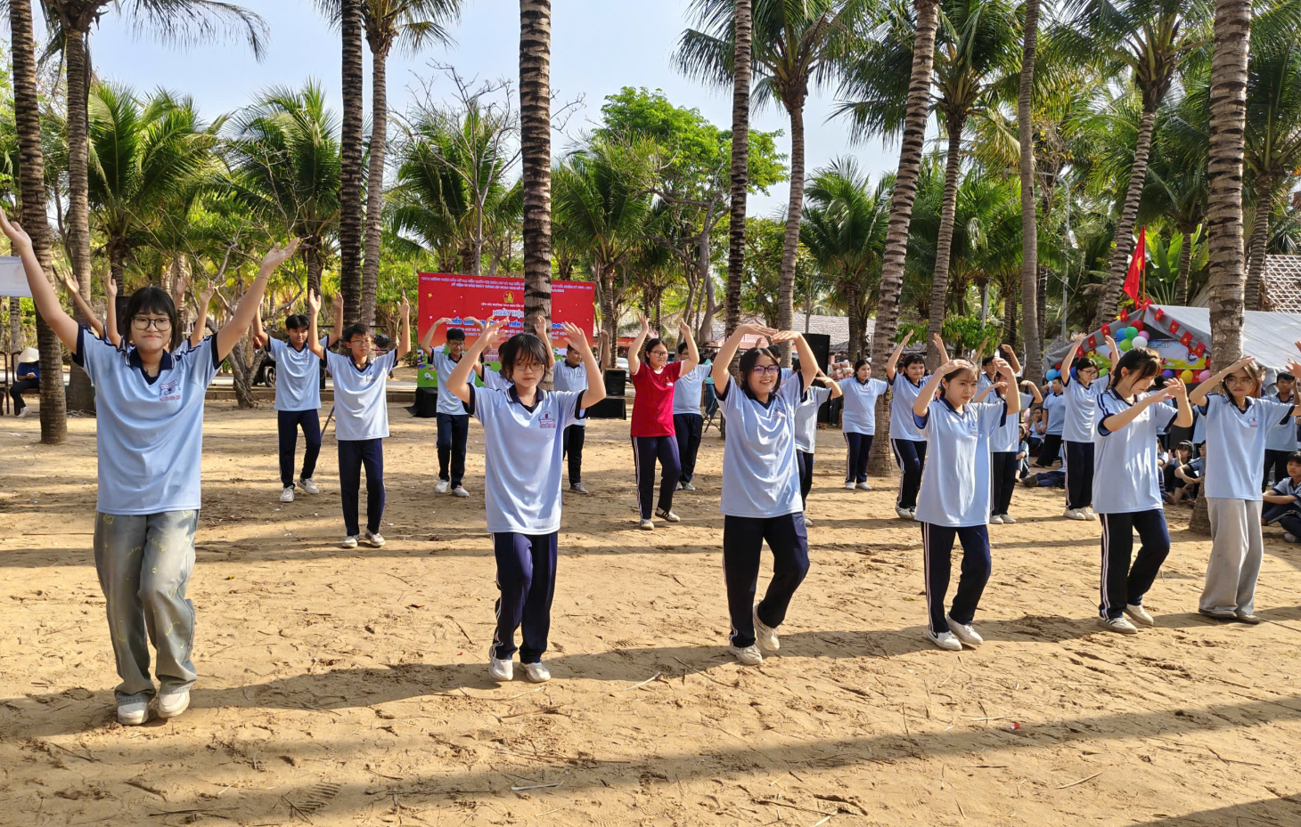 Một trong những điểm nhấn nổi bật của hội trại chính là sự tham gia đông đảo, nhiệt tình và đầy năng lượng của các em học sinh khối 6 và khối 7. Khi bước vào các phần thi và hoạt động vận động, học sinh toàn trường đã thực sự hòa mình, “cháy hết mình” với tinh thần sôi nổi, hào hứng. Những tiếng hò reo, cổ vũ vang dội đã làm bừng sáng cả không gian Mũi Né, tạo nên bầu không khí náo nhiệt, đầy cảm xúc. Từ những phút giây còn e dè ban đầu, các em đã nhanh chóng vượt qua chính mình, tích cực tham gia vào từng hoạt động, thể hiện rõ nét tinh thần đoàn kết, ý chí vươn lên và sức trẻ tràn đầy nhiệt huyết.
