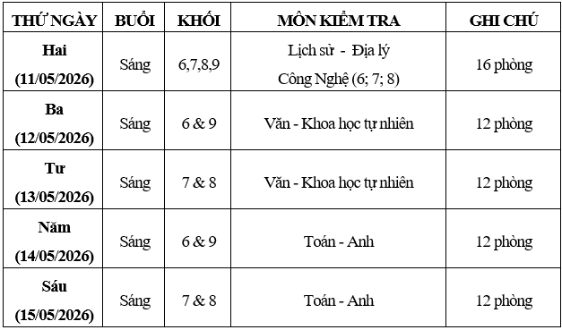 Trường THCS Nguyễn Đình Chiểu thông báo đến toàn thể phụ huynh và các em học sinh lịch kiểm tra cuối học kỳ II năm học 2025 - 2026 cụ thể như sau: