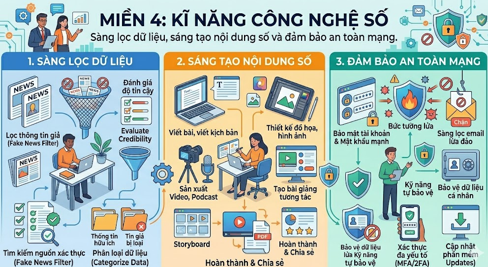 Miền 4: Kĩ năng công nghệ số (Sàng lọc dữ liệu, sáng tạo nội dung số và đảm bảo an toàn mạng).